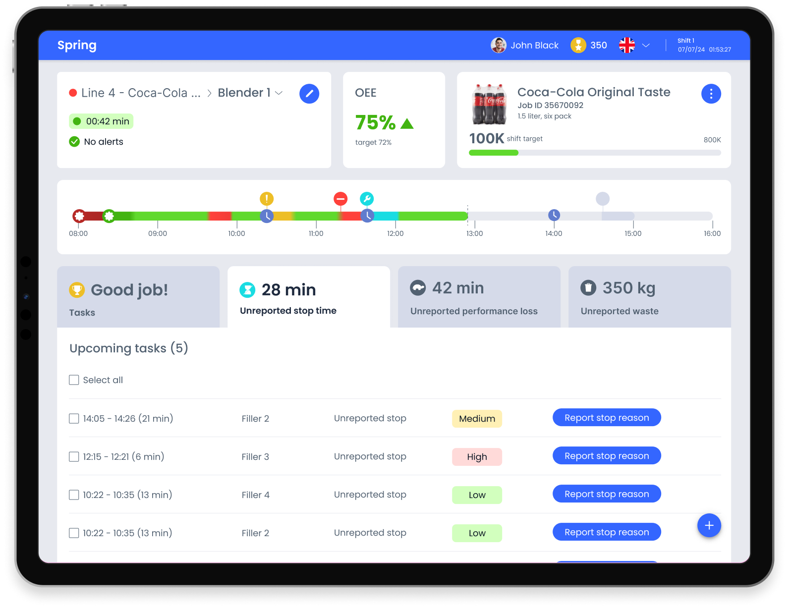 Color indicators matching those used on the production line (green/red) provide instant information recognition. A clear hierarchy of elements helps employees quickly orient themselves in the situation and make decisions without delay. In the timeline, a gradient was applied, which emphasizes dynamics and allows users to visually perceive the speed of state changes.